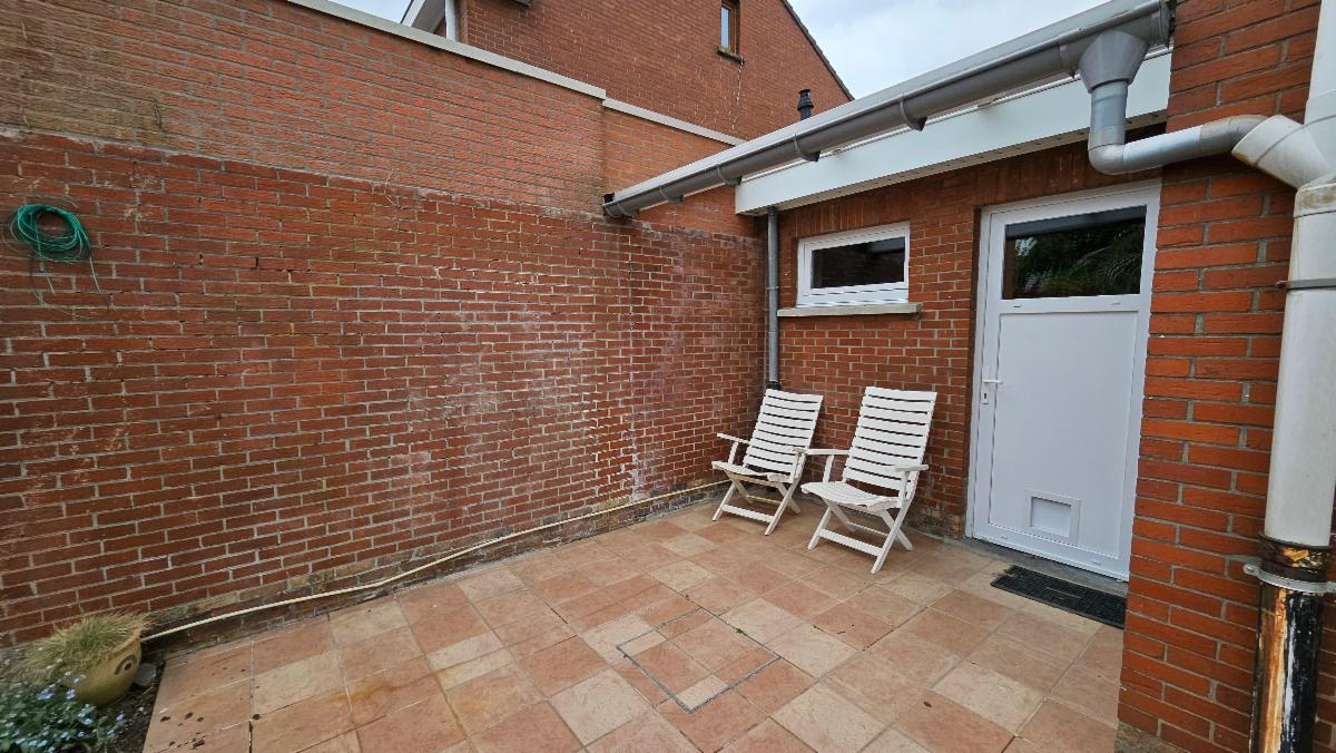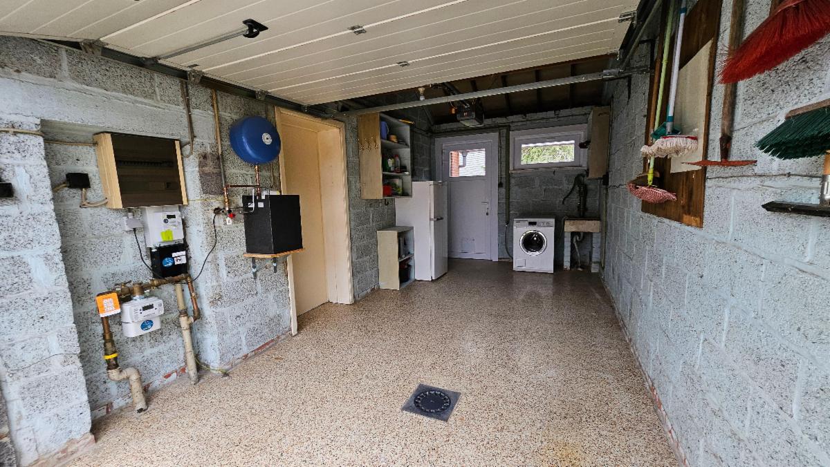 Rez-de-chaussée : hall d'entrée avec escalier apparent et WC séparé, pièce de vie spacieuse, cuisine meublée sur l’avant, spacieux garage avec porte sectionnelle motorisée et espace buanderie, jardin spacieux avec terrasse, accès au garage via le jardin, terrasse, store ban motorisé, chalet de jardin ;