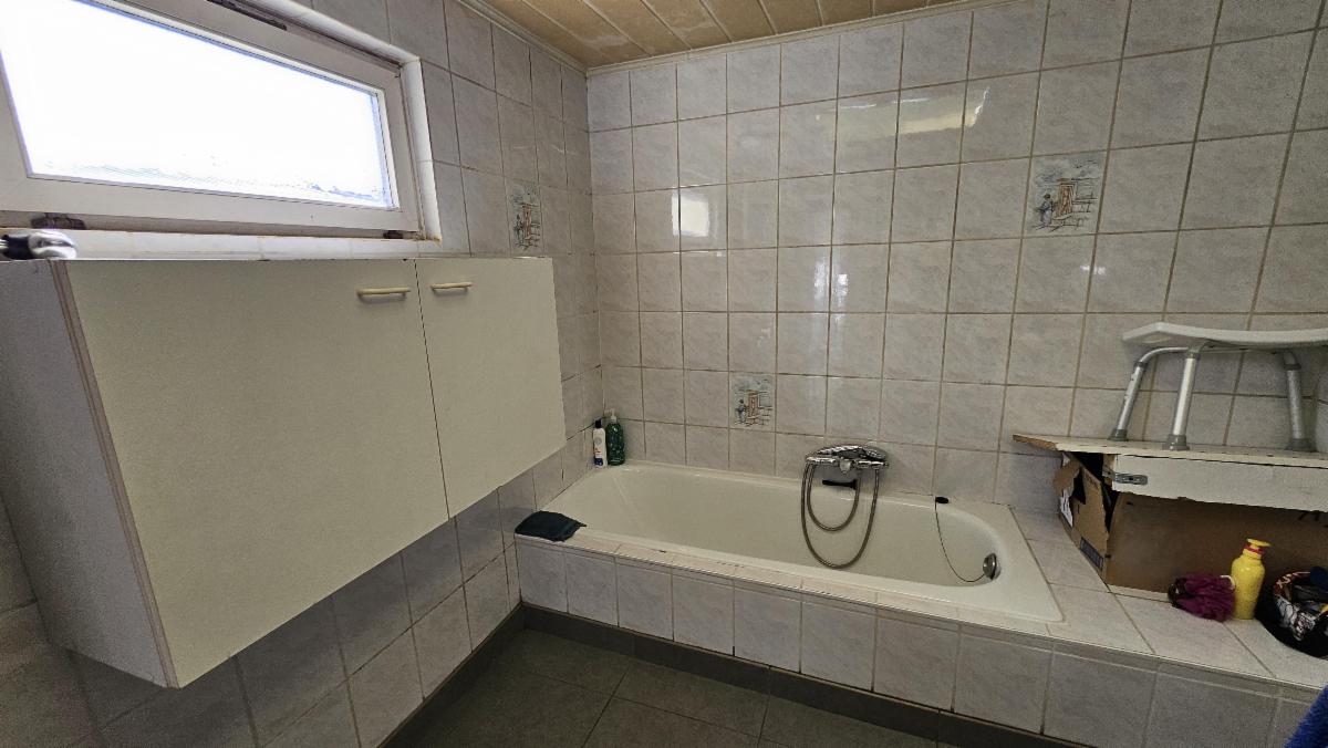 Rez-de-chaussée : hall d'entrée, pièce de vie composée d'un salon et d'une salle à manger équipée d'un feu à pellets, cuisine équipée (taque au gaz avec bonbonne, four, double évier et hotte), WC séparé, salle de bain à l’arrière (baignoire, lavabo et boiler électrique), jardin avec cour extérieure et annexe de rangement (type kotch). Accès arrière permettant la construction éventuelle d’un garage donnant sur un chemin ;