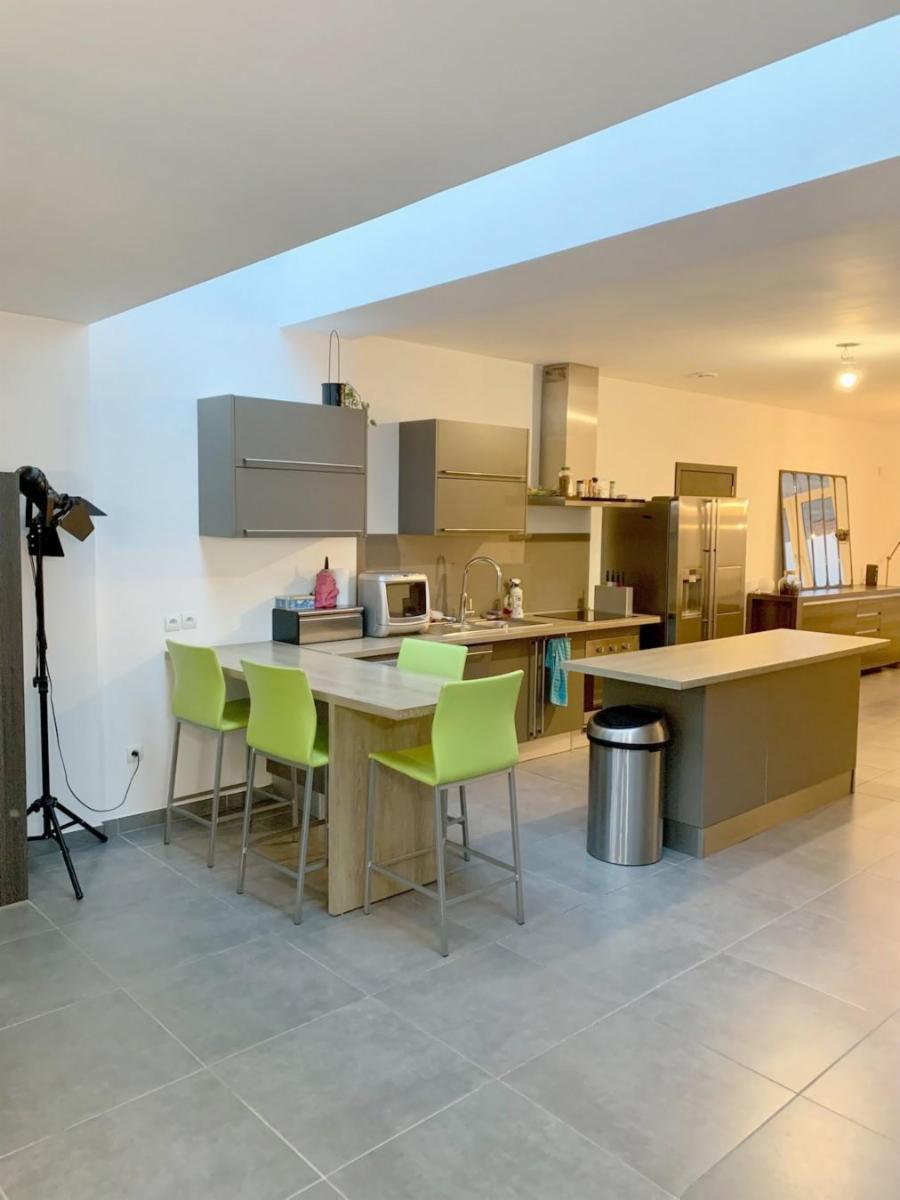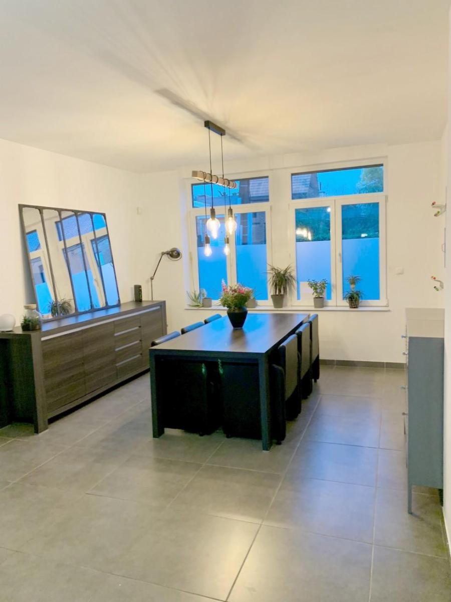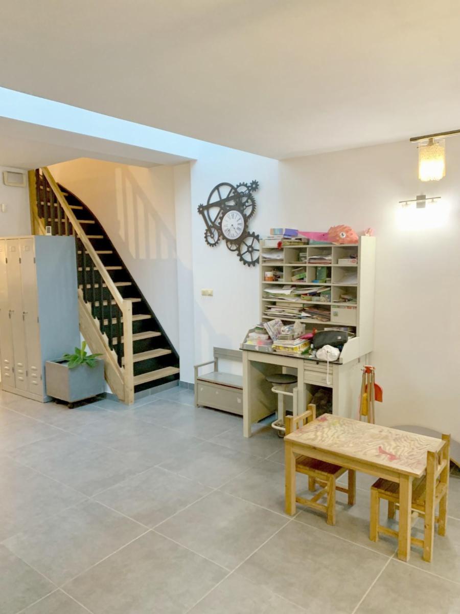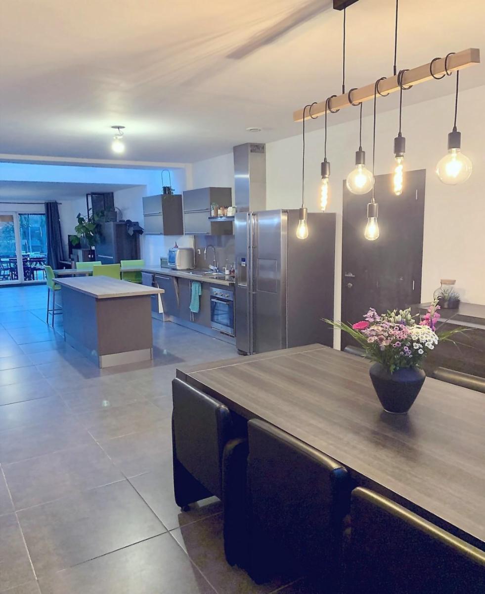 Maison entièrement rénovée avec jardin de +/- 450 m² et parking privé pour 2 voitures, comprenant :