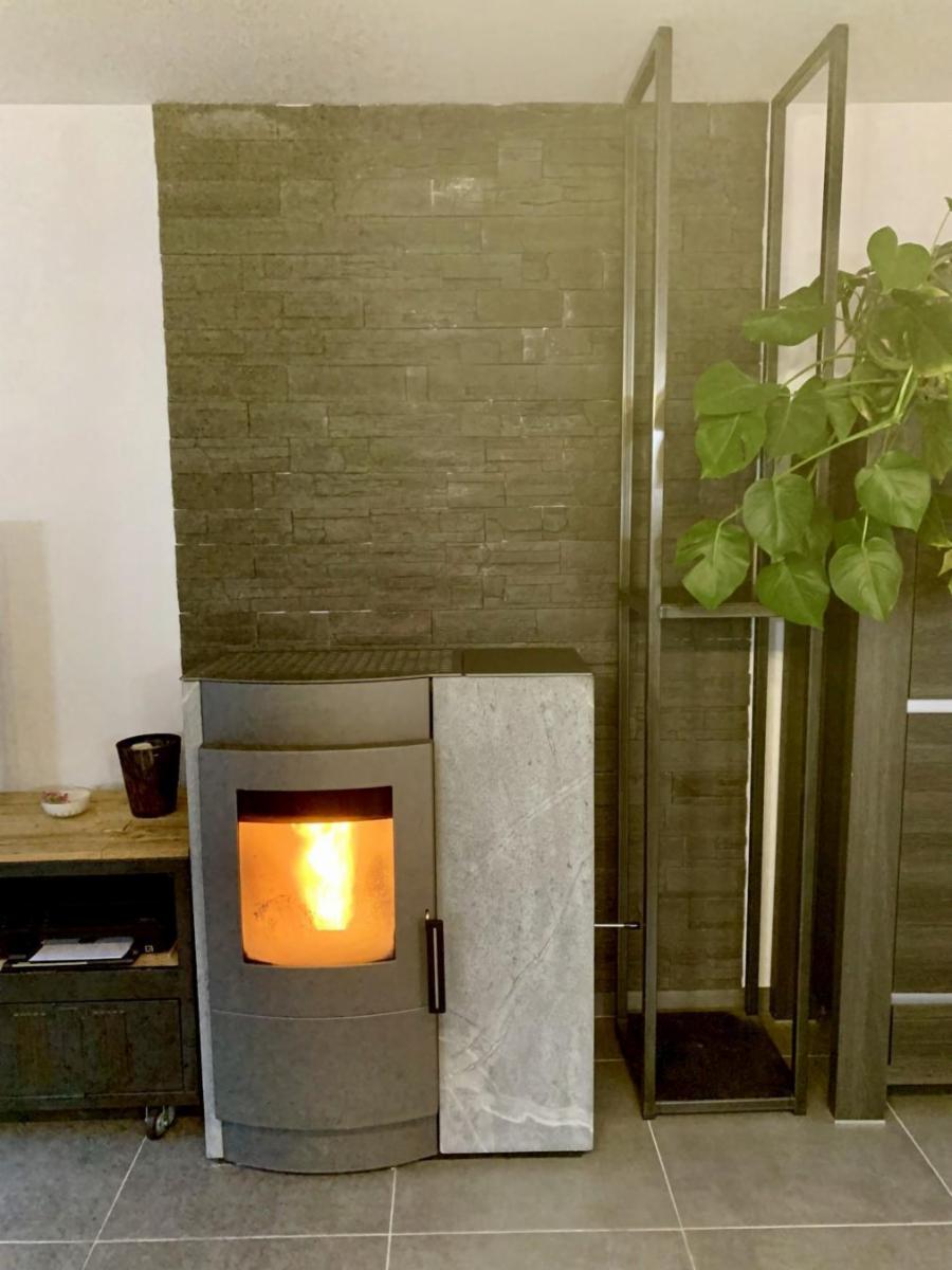 Feu au bois / pellets avec pierre réfractaire (inclus dans la vente, en l'état), châssis en PVC (double vitrage), 13 panneaux photovoltaïques (facture d'électricité mensuelle de 47€ pour famille de 5).